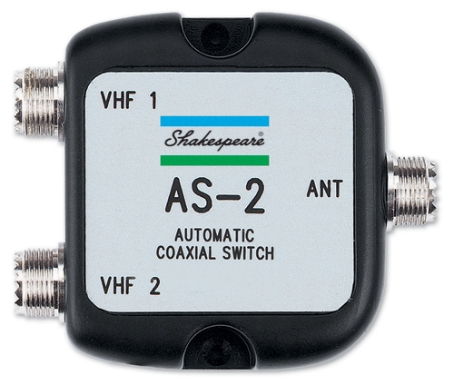 Shakespeare AS-2 otomatik anahtar. İki telsiz, bir antende kullanılır. Bir kabinde, bir de fly-bridge’de telsiz olduğu düşünülürse, hangi telsizin mikrofon mandalına basılırsa anahtar o telsizi antene yönlendirir. Diğer telsizin mikrofon mandalına basılıncaya dek aynı telsiz kullanımda kalır.