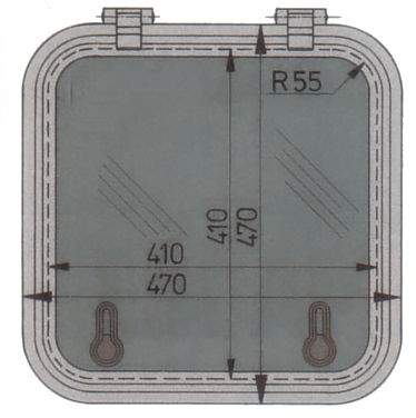 Vetus hatch. Tip libero. Elde parlatılmış anodize alüminyum çerçevesi 55 mm köşe açılıdır. Camı 12 mm duman rengi akriliktir. İç finisyon çerçevesi ve sineklik opsiyonel ekipman olarak sunulmaktadır.