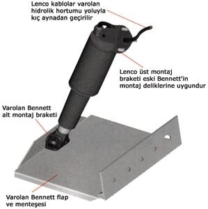 Lenco terfi kiti. Eskimiş, sorunlu hidrolik Bennett flap sistemini kolayca ve minimum maliyet ile modern, yüksek teknolojili Lenco´ya terfi ettirmenizi sağlar. Standart boyda Bennett silindirler (A110A) takılı olan tüm teknelere uygulanabilir. Kit içeriğinde yeni delik, dolgu gerektirmeden Lenco´yu uygulamanız için her şey mevcuttur. Bennett hidrolik pompa ve silindirler çıkartılır. Bennett´e uygun üst montaj braketine sahip Lenco silindirler takılır. Mevcut Bennett kablo yoluyla panele bağlantı yapıldığında montaj tamamlanmıştır. Kit içeriği bir çift Lenco silindir ve üst montaj braketinden oluşmaktadır.